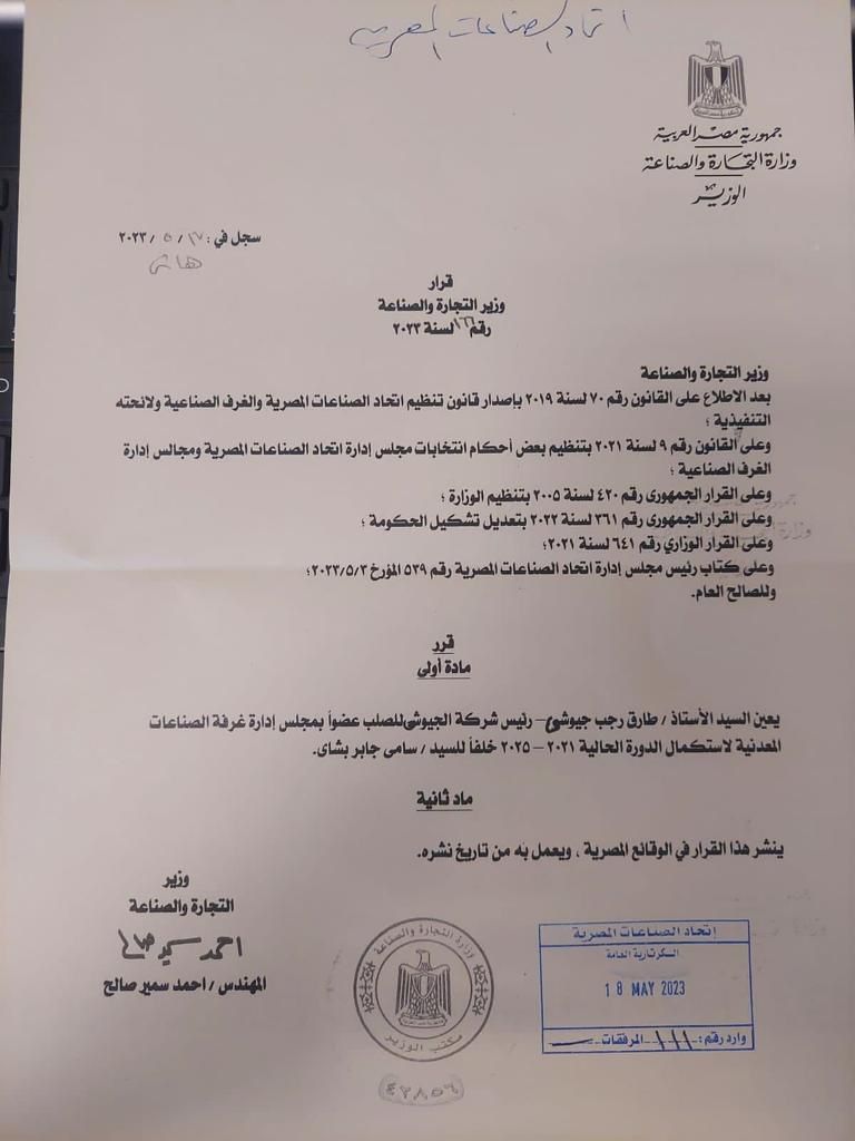 أصدر المهندس أحمد سمير، وزير التجارة والصناعة، قراره رقم 166 لسنة 2023، بتعيين طارق الجيوشي رئيس مجلس إدارة مجموعة الجيوشي للصلب، عضوًا بمجلس إدارة غرفة الصناعات المعدنية باتحاد الصناعات لاستكمال الدورة الحالية 2021 - 2025 وذلك خلفًا لعضو المجلس المهندس سامي جابر بشاي.
