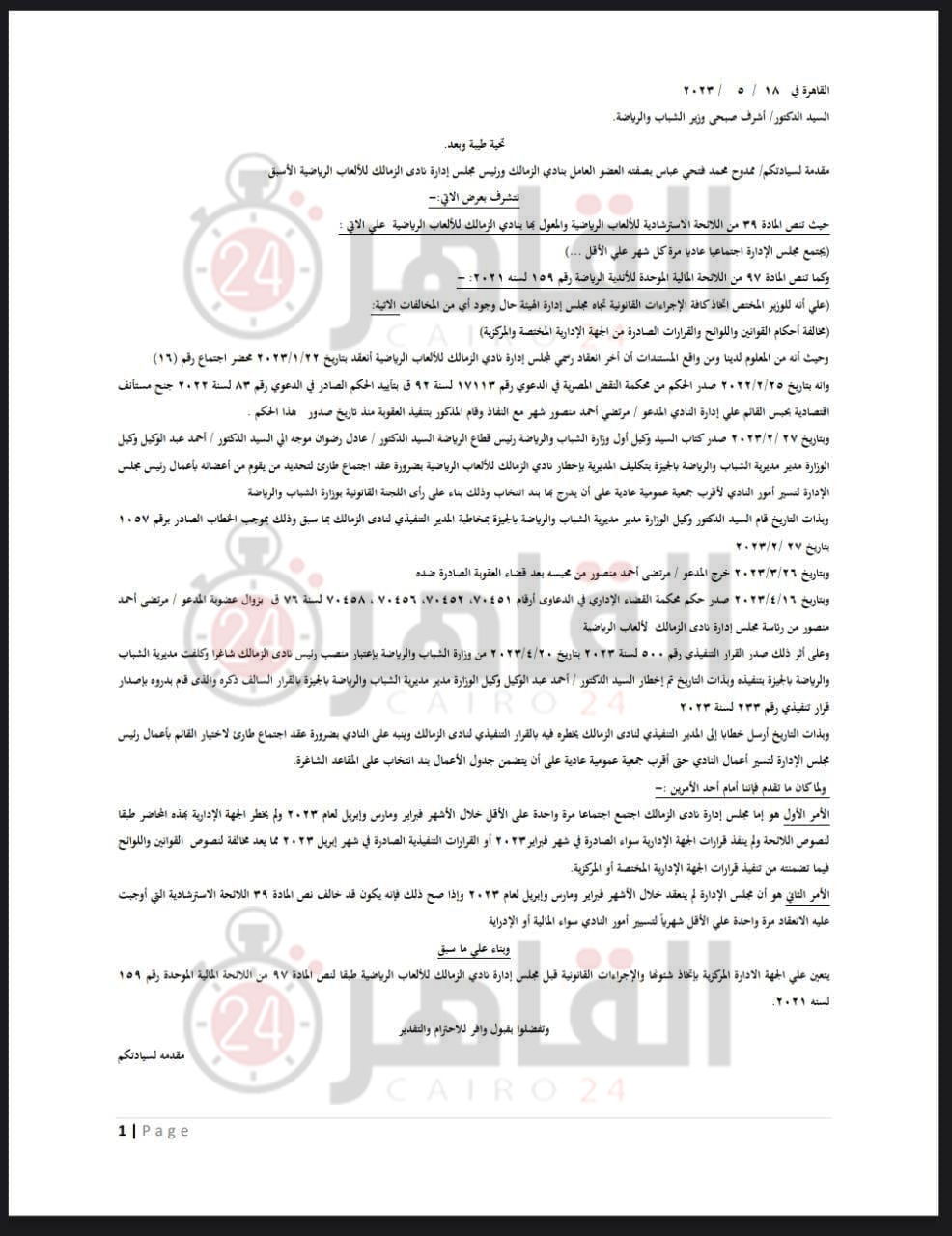 وطلب عباس في شكواه بأنه بناء على ما سبق فإنه يطالب الجهة الإدارية باتخاذ شؤنها وإجراءاتها القانونية تجاه مجلس إدارة نادي الزمالك، طبقا لنص المادة 97 من اللائحة المالية الموحدة رقم 159 لسنة 2021.
