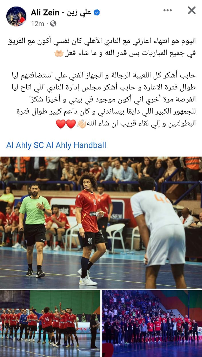 وقال علي زين في منشوره عبر صفحته على فيس بوك: اليوم هو انتهاء إعارتي مع النادي الأهلي كان نفسي أكون مع الفريق في جميع المباريات بس قدر الله وما شاء فعل.