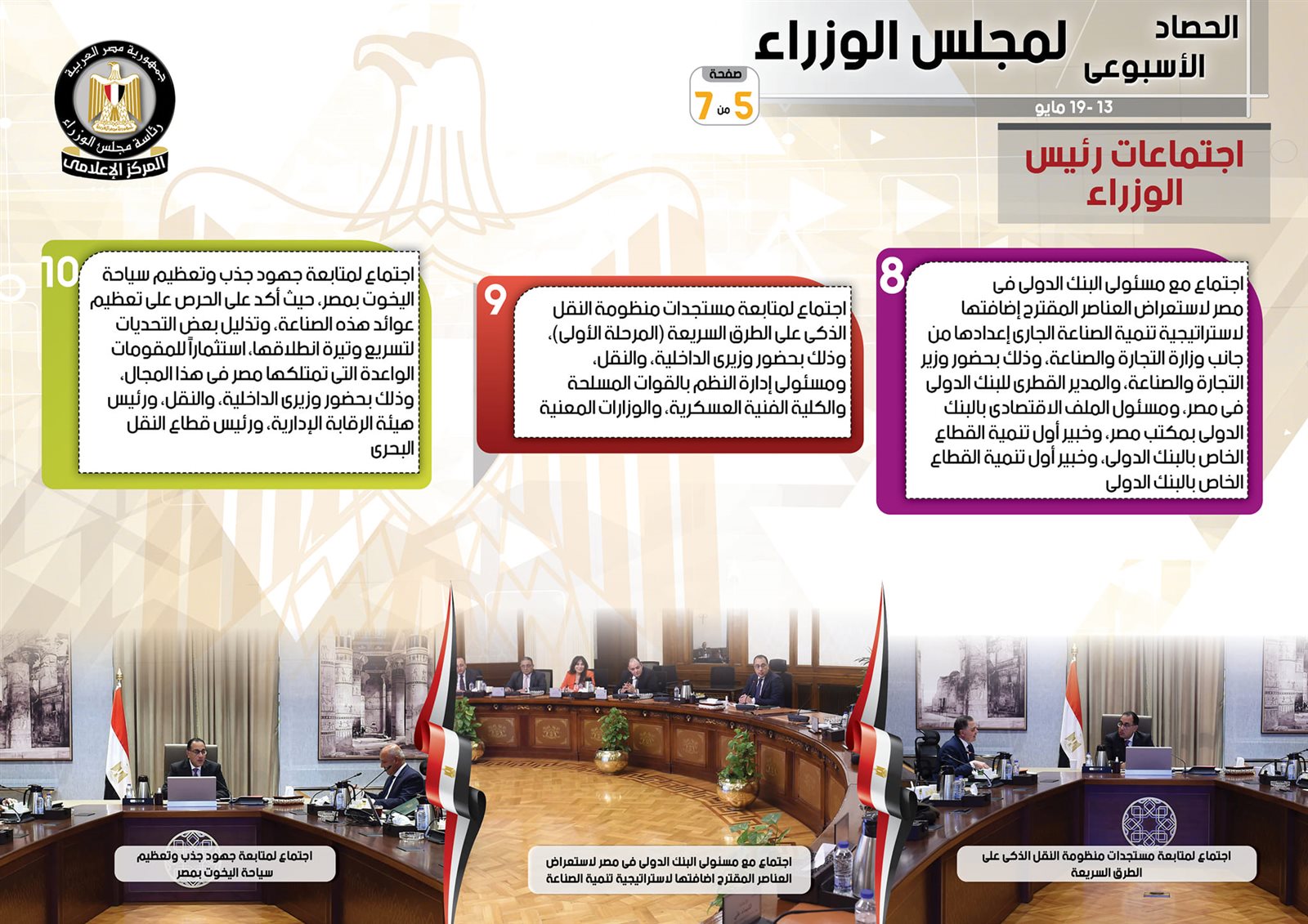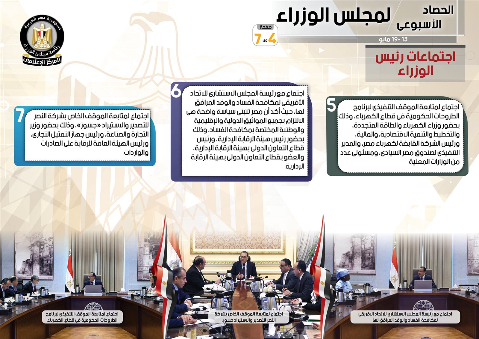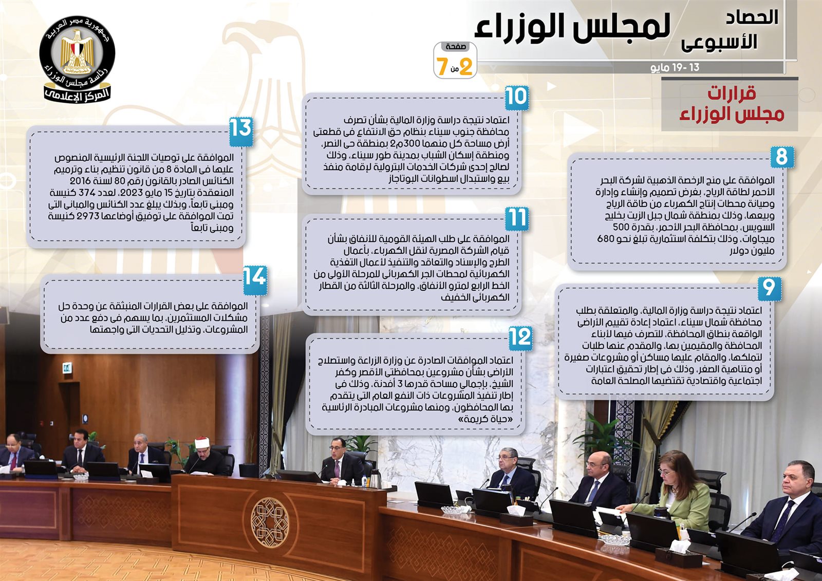 نشر المركز الإعلامي لـ مجلس الوزراء، تقريرًا شمل إنفوجرافات سلط من خلالها الضوء على الحصاد الأسبوعي لمجلس الوزراء، وذلك خلال الفترة من 13 حتى 19 مايو 2023، والذي تضمن الموافقة على عدد من القرارات، فضلًا عن الاجتماعات التي عقدها الدكتور مصطفى مدبولي، رئيس مجلس الوزراء، بالإضافة إلى ما نفذه من أنشطة.