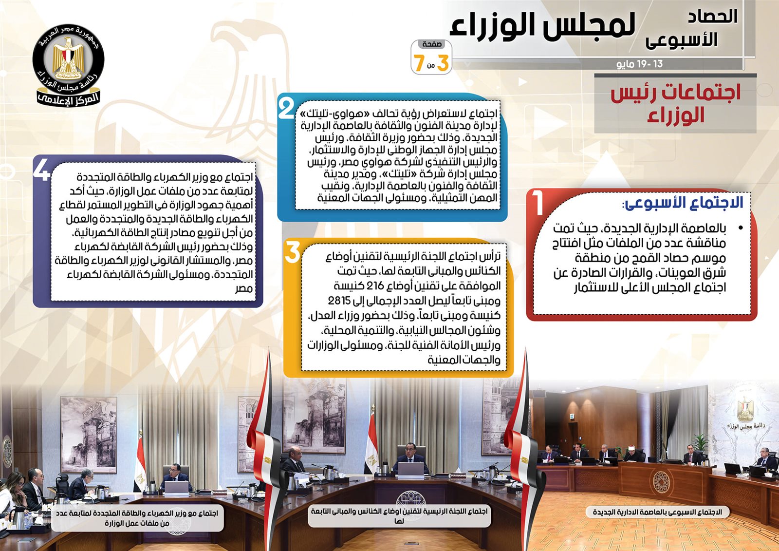 أما عن الاجتماعات التي عقدها رئيس مجلس الوزراء أورد التقرير، اجتماعًا لاستعراض رؤية تحالف "هواوى-تليتك" لإدارة مدينة الفنون والثقافة بالعاصمة الإدارية الجديدة، وذلك بحضور وزيرة الثقافة، ورئيس مجلس إدارة الجهاز الوطني للإدارة والاستثمار، والرئيس التنفيذي لشركة هواوي مصر، ورئيس مجلس إدارة شركة "تليتك"، ومدير مدينة الثقافة والفنون بالعاصمة الإدارية، ونقيب المهن التمثيلية، ومسئولي الجهات المعنية، كما ترأس اجتماع اللجنة الرئيسية لتقنين أوضاع الكنائس والمباني التابعة لها، حيث تمت الموافقة على تقنين أوضاع 216 كنيسة ومبنى تابعًا ليصل العدد الإجمالي إلى 2815 كنيسة ومبنى تابعًا، وذلك بحضور وزراء العدل، وشئون المجالس النيابية، والتنمية المحلية، ورئيس الأمانة الفنية للجنة، ومسئولي الوزارات والجهات المعنية.