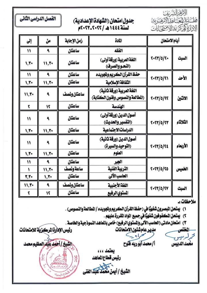 يؤدي طلاب وطالبات الشهادة الإعدادية بمحافظة سوهاج اليوم السبت، امتحان مادة الفقة - فترة أولى- وامتحان مادة النحو - فترة ثانية - ضمن امتحانات الفصل الدراسي الثاني للعام الدراسي 2022 / 2023، والتي تستمر حتى يوم السبت الموافق 27 مايو الجاري.