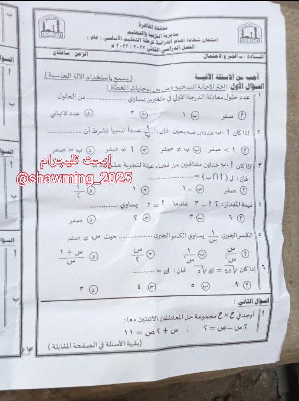 تداولت جروبات الغش باسم شاومينج عبر تطبيق تليجرام، اليوم السبت، صورًا مزعومة لأسئلة امتحان الجبر لطلاب الشهادة الإعدادية 2023 في محافظة القاهرة، ضمن امتحانات امتحانات نهاية العام للفصل الدراسي الثاني 2022-2023.