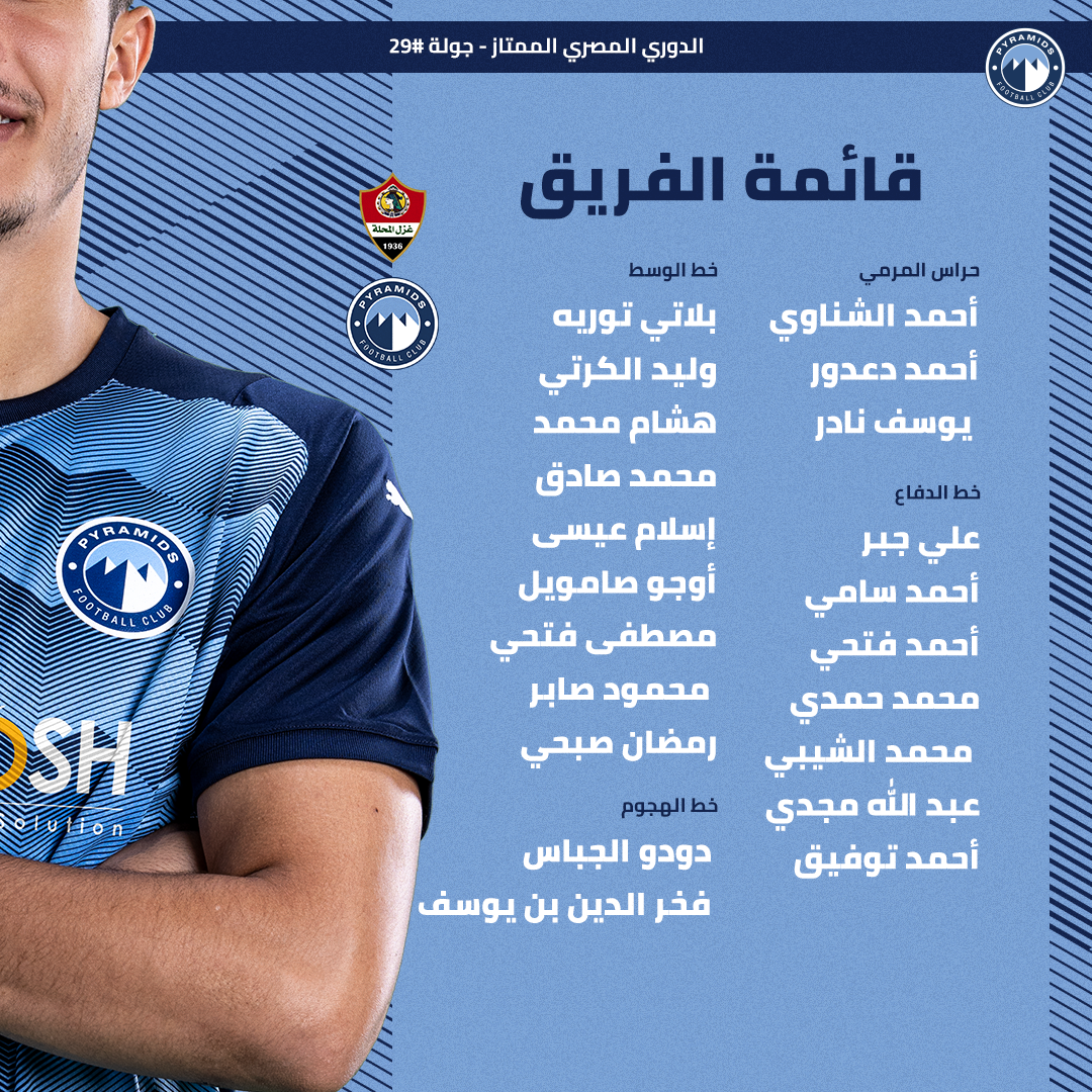 يتوقع أن يختار جيمي باتشيكو، تشكيل بيراميدز اليوم لمباراة غزل المحلة في الدوري المصري، كالتشكيل الآتي:
