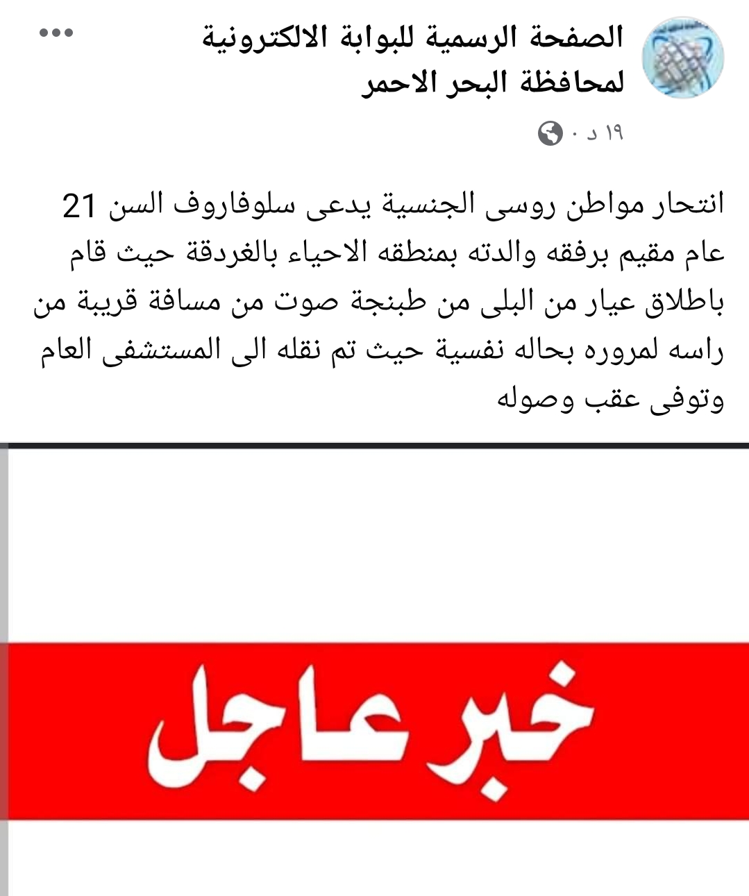وأعلنت الصفحة الرسمية لمحافظة البحر الأحمر، عبر صفحتها الرسمية بـ فيس بوك انتحار مواطن روسي الجنسية يدعى سلوفاروف ويبغ سنه 21 عاما.