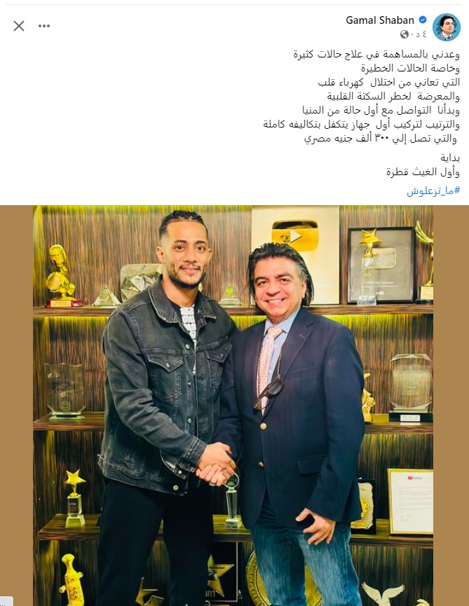 وكتب جمال شعبان منشورًا، عبر حسابه الشخصي بموقع التواصل الاجتماعي فيس بوك، قال فيه: وعدني بالمساهمة في علاج حالات كثيرة، وبخاصة الحالات الخطيرة، التي تعاني من اختلال كهرباء قلب، والمعرضة لخطر السكتة القلبية، وبدأنا التواصل مع أول حالة من المنيا، والترتيب لتركيب أول جهاز يتكفل بتكاليفه كاملة، والتي تصل إلى 300 ألف جنيه مصري.. البداية وأول الغيث قطرة.