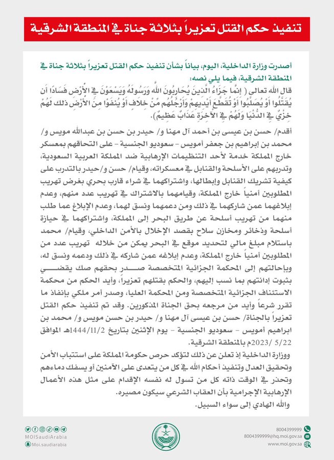 وأضافت قد تم تنفيذ حكم القتل تعزيرا بالجناة حسن بن عيسى آل مهنا وحيدر بن حسن مويس ومحمد بن إبراهيم أمويس، اليوم الاثنين، لالتحاقهم بمعسكر تنظيم إرهابي ضد المملكة.