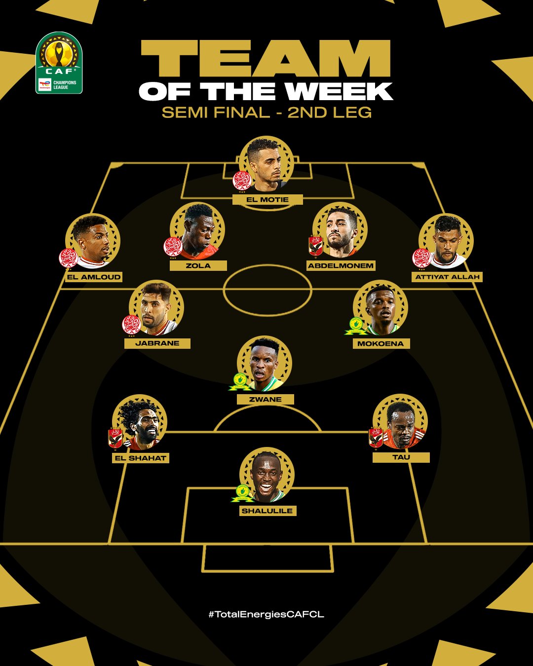 وضم التشكيل المثالي لإياب نصف نهائي دوري أبطال إفريقيا، 3 لاعبين من الأهلي، و3 من صن داونز، و5 لاعبين من الوداد المغربي.