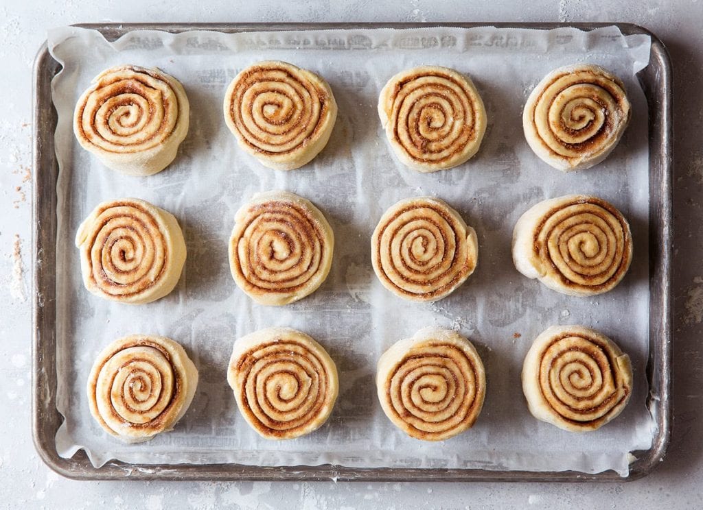 تقطيع رول السينابون على شكل قطع متوسطة الحجم أو حسب الرغبة. - نرص عجينة السينابون بعد تشكيلها في صينية كبيرة، مع تغليفها بورق الزبدة.