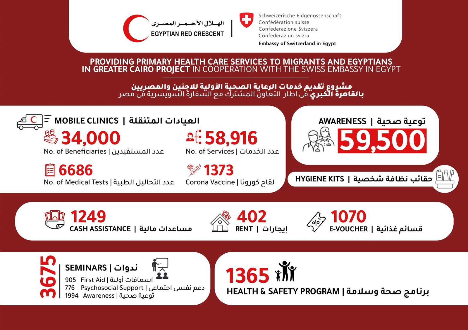 أعلنت جمعية الهلال الأحمر المصري، تقديم خدمات رعاية صحية لنحو 34 ألف لاجئ ومصري، في إطار التعاون مع السفارة السويسرية بالقاهرة لتنفيذ مشروع تقديم خدمات الرعاية الصحية الأولية للمهاجرين والمصريين في القاهرة الكبرى والمستمر منذ عدة أعوام.