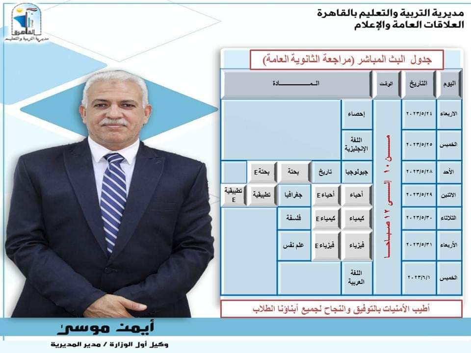 أعلنت مديرية التربية والتعليم بالقاهرة، برعاية أيمن موسى وكيل أول وزارة التربية والتعليم، ومدير مديرية التربية والتعليم بالقاهرة، مواعيد البث المباشر لمراجعة المواد الدراسية للثانوية العامة، في جميع المواد الدراسية العلمية والأدبية، على أن تبدأ من 24 مايو الجاري، وحتى 1 يونيو المقبل.