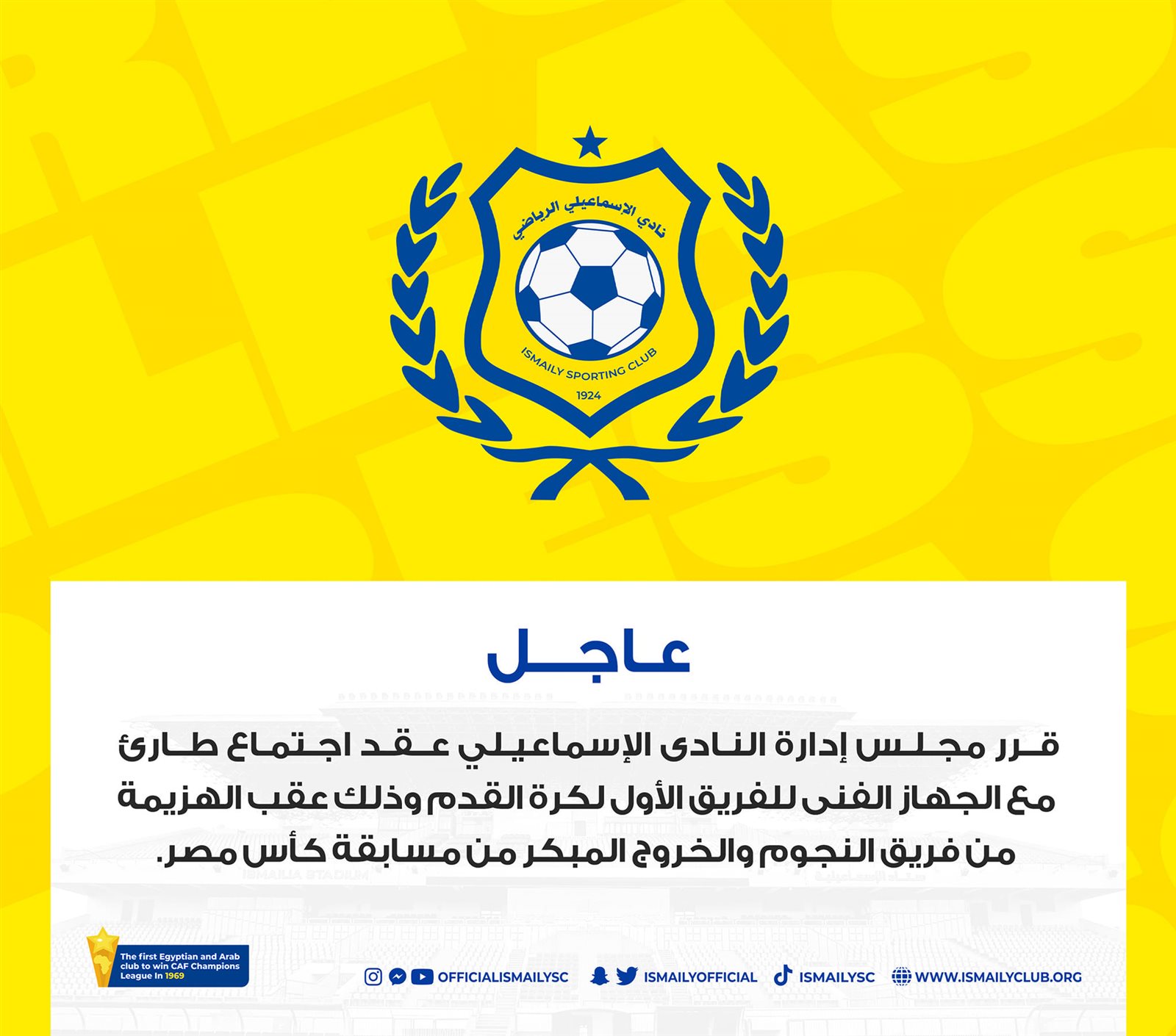 قرر مجلس إدارة نادي الإسماعيلي عقد اجتماع عاجل لبحث هزيمة الفريق الأول لكرة القدم بالنادي على يد فريق النجوم، والخروج من منافسات كأس مصر للموسم الرياضي 2022-2023.