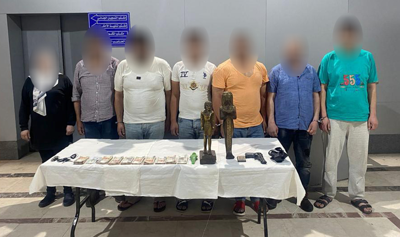 عقب تقنين الإجراءات، وبالتنسيق مع قطاع الأمن العام ومديريتي أمن الجيزة، والإسكندرية، تم استهدافهم وأمكن ضبطهم، وبحوزتهم 3 سيارات مملوكة لثلاثة من المتهمين ومبالغ مالية وعملات محلية، وأجنبية، وطبنجة صوت وعدد من الطلقات ومحدث صوت و3 تماثيل مُقلدة تُستخدم في أعمال النصب، و7 هواتف محمول، بفحصهم تبين قيامهم بعرض التماثيل المُقلدة المضبوطة بحوزتهم على مواقع التواصل الإجتماعي بقصد النصب على ضحاياهم.