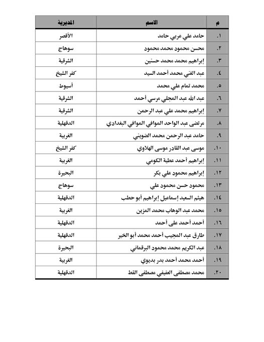 ونشرت وزارة الأوقاف أسماء الناجحين من المتقدمين لمسابقة الخطابة بالمكافأة على بند التحسين مع إقامة الشعائر (المجموعة الثالثة)، وهم: