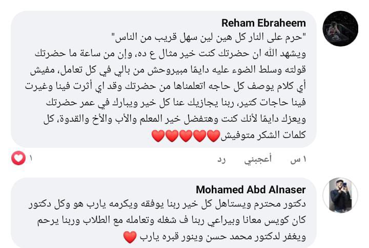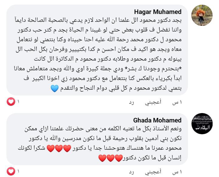 بينما رأت بسنت العربي، الطالبة بكلية التربية جامعة حلوان، بأنه ونعم الأستاذ بكل ما تعنيه الكلمة، ومن أفضل الشخصيات بالكلية، معقبة: دكتور محمود مثقف جدًا مش مجرد حافظ كلمتين بيشرحهم وخلاص.. هتوحشنا كتير يا دكتور والله.