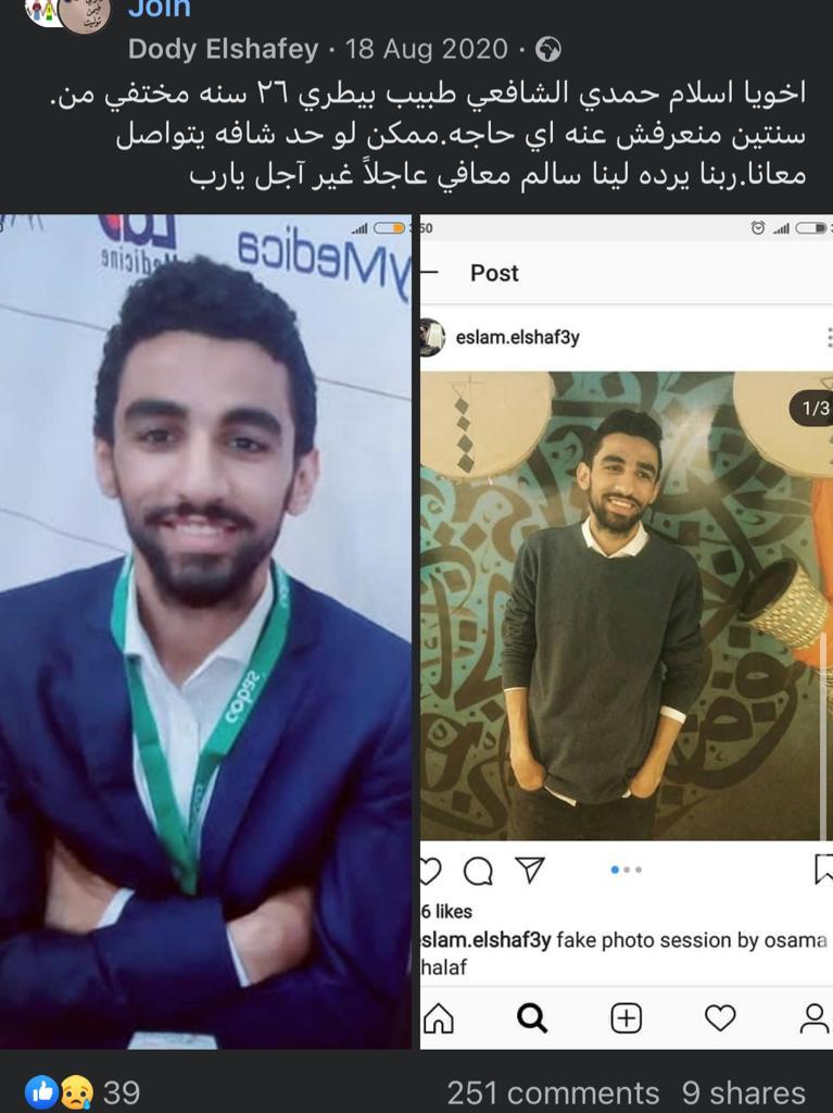 في عام 2020 نشرت دودي الشافعي التي يتصدر اسمها فيسبوك الآن، على أحد الجروبات بوست تقول فيه أخويا إسلام حمدي الشافعي، طبيب بيطري 26 سنة، مختفي من سنتين، منعرفش عنه أي حاجه، ممكن لو حد شافه يتواصل معانا، ربنا يرده لينا سالم معافي عاجلا غير آجل يا رب.