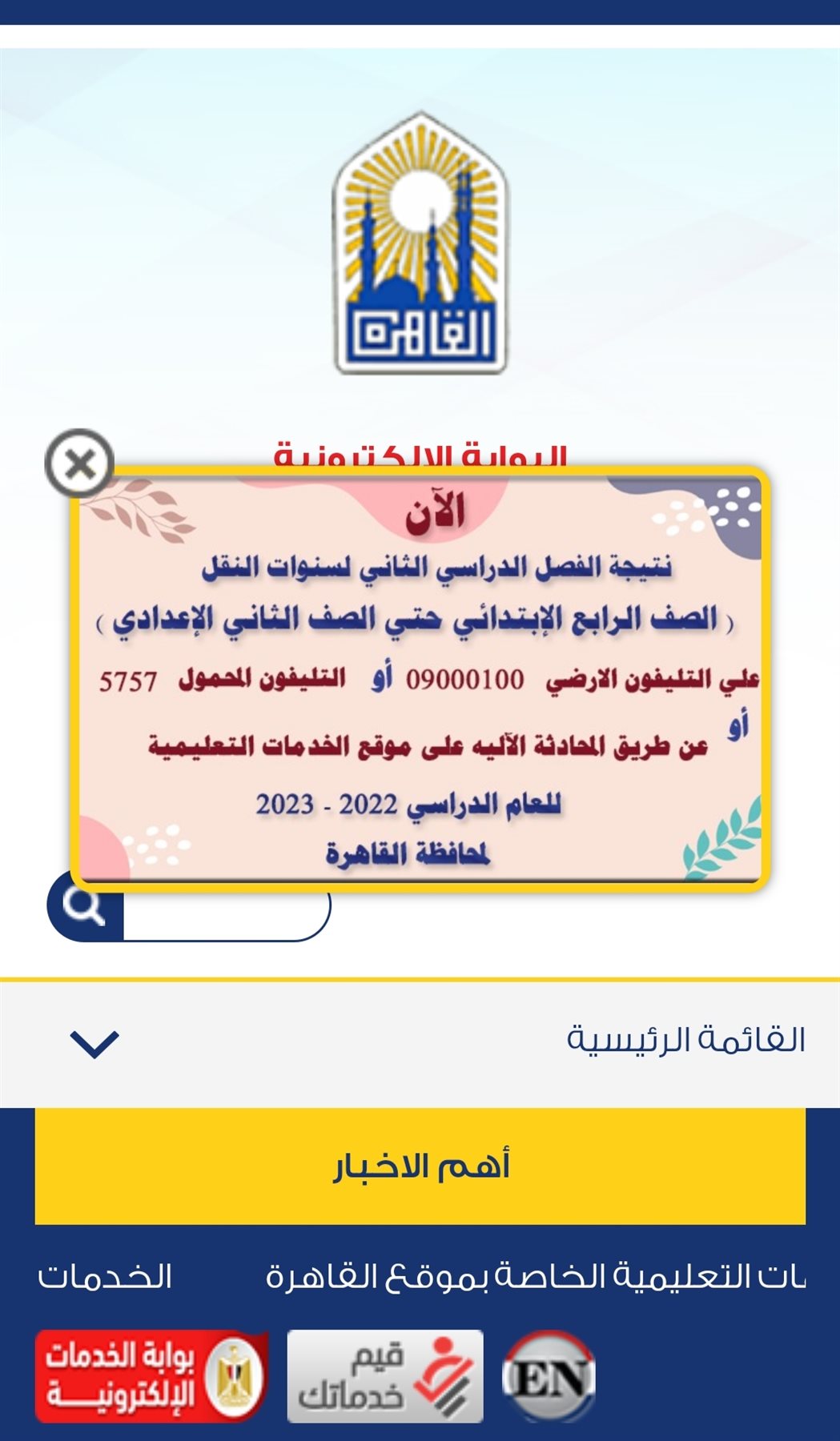 كما أعلنت مديرية التربية والتعليم والتعليم الفني بمحافظة القاهرة، نتيجة الترم الثاني للعام 2022-2023، إلكترونيًا لسنوات النقل من الصف الرابع الابتدائى حتى الصف الثاني الإعدادي يوم الخميس الماضي.