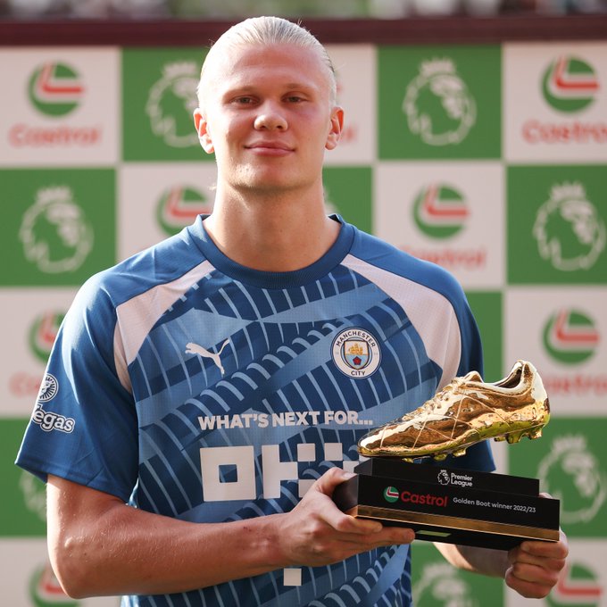 وفاز النرويجي إرلينج براوت هالاند نجم هجوم فريق مانشستر سيتي، رسميا بجائزة الحذاء الذهبي كهداف مسابقة الدوري الإنجليزي الممتاز هذا الموسم، وذلك بعدما احتل الصدارة برصيد 36 هدفا.