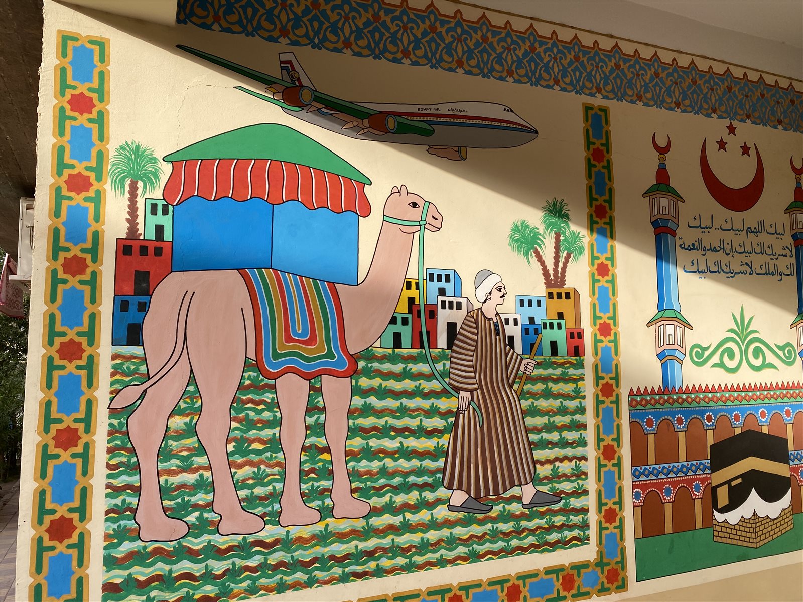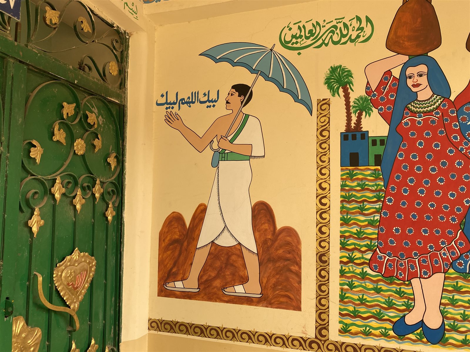 ويواصل الطيب: رسمت على جدران المنازل بداية رحلة الحج برسم وسائل المواصلات المؤدية لبيت الله الحرام من طيارة أو مركب وأتوبيس أو حتى جمال، وبرسم صورة الكعبة، ورسم الحجاج بملابس الإحرام البيضاء وعبارات توثق تاريخ رحلة الحج وآيات من القرآن الكريم.