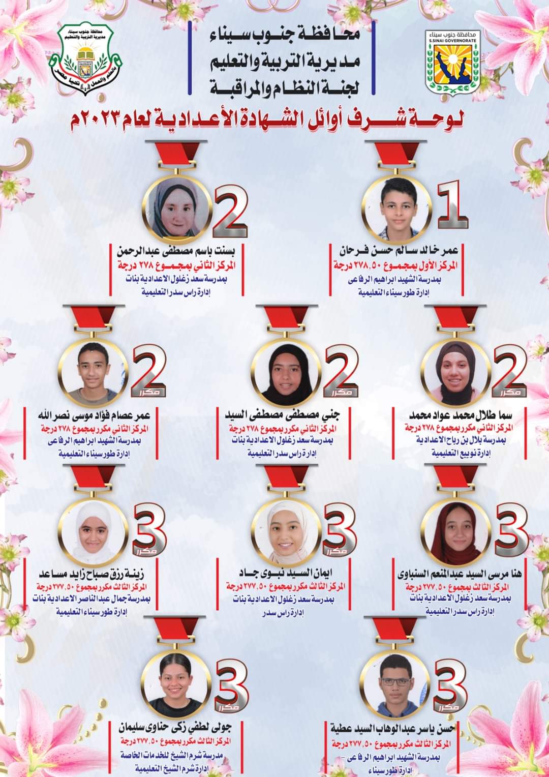 أسماء العشرة الأوائل للشهادة الإعدادية بجنوب سيناء