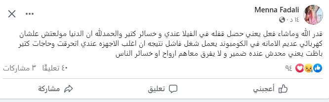 وكتبت منة فضالي منشورًا، عبر حسابها الشخصي بموقع التواصل الاجتماعي فيسبوك، قالت فيه: قدر الله وما شاء فعل، حصل قفلة في الفيلا عندي، وخسائر كتير والحمد لله أن الدنيا مولعتش، علشان كهربائي عديم الأمانة في الكومبوند، يعمل شغل فاشل نتيجته إن أغلب الأجهزة عندي اتحرقت، وحاجات كتير باظت، يعني محدش عنده ضمير، ولا يفرق معاهم أرواح أو خسائر الناس.