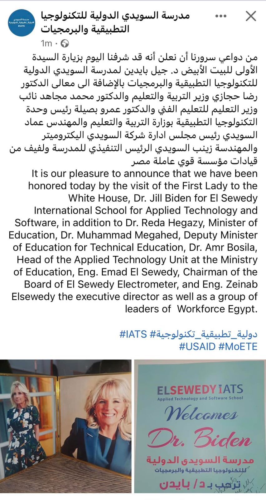 فيما قالت مدرسة السويدي تعليقًا على الزيارة: من دواعي سرورنا أن نعلن أنه قد شرفنا اليوم بالزيارة السيدة الأولى للبيت الأبيض الدكتورة جيل بايدين لمدرسة السويدي الدولية للتكنولوجيا التطبيقية والبرمجيات.