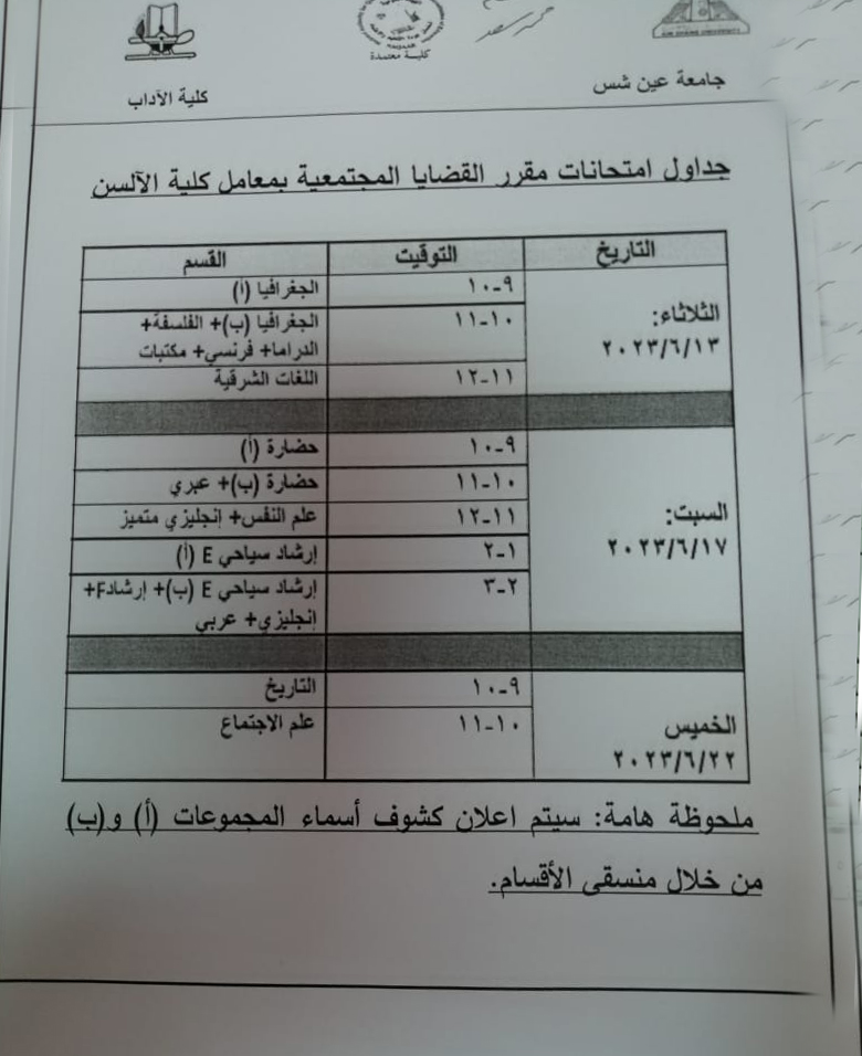 جدول امتحانات مقرر القضايا المجتمعية لطلاب آداب عين شمس