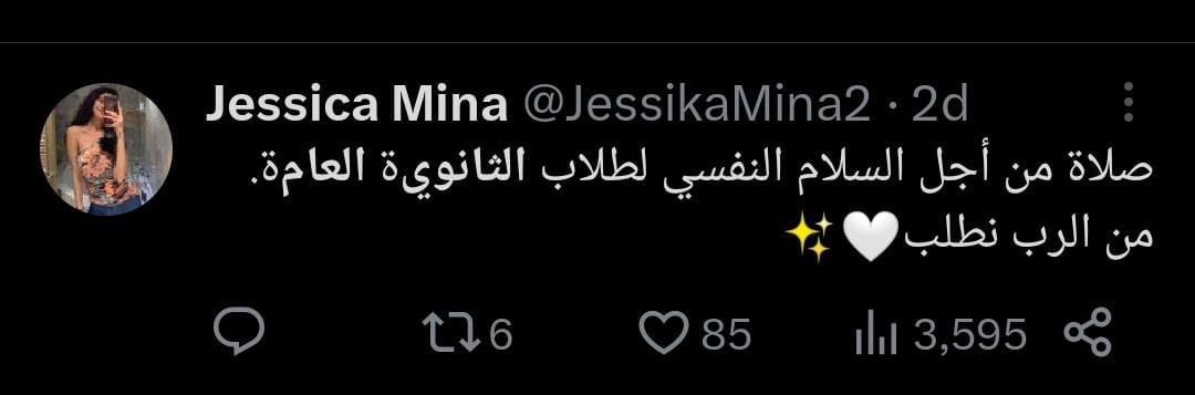 وفي ذات السياق، دعت جيزيكا مينا لطلاب الثانوية العامة قائلة: صلاة من أجل السلام النفسي لطلاب الثانوية العامة من الرب نطلب.