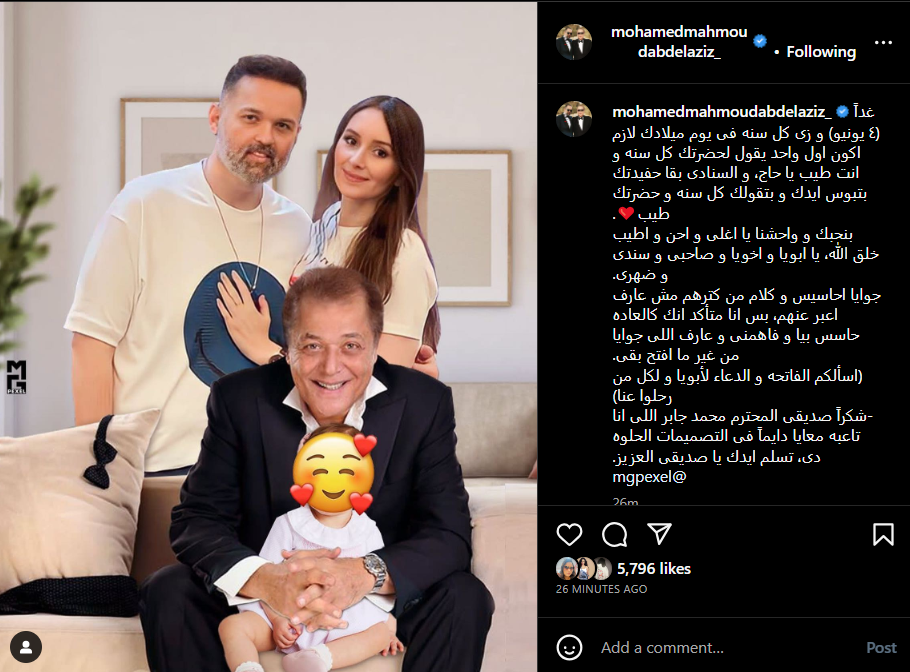 ونشر محمد محمود عبد العزيز صورة مُعدلة تجمعه بزوجته وابنته ووالده الراحل، عبر حسابه الشخصي على انستجرام، وعلق قائلًأ: غدًا 4 يونيو وزي كل سنة في يوم ميلادك لازم أكون أول واحد يقول لحضرتك كل سنة وانت طيب يا حاج.. والسنة دي بقى حفيدتك بتبوس إيدك وبتقولك كل سنة وحضرتك طيب.