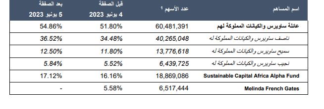 وبعد بيع ميلندا غيتس حصتها في الشركة ارتفعت حصة عائلة ساويرس والكيانات المملوكة لها إلى 54.86%؛ ناصف ساويرس والكيانات المملوكة له بنسبة من 34.48% إلى 36.52% وسميح ساويرس بنسبة من 11.80% إلى 12.50% ونجيب ساويرس والكيانات المملوكة له بنسبة من 5.52% إلى 5.84%، بالإضافة إلى ارتفاع حصة صندوق ألفا لرأس المال المستدام لإفريقيا بنسبة من 16.16% 17.12%.