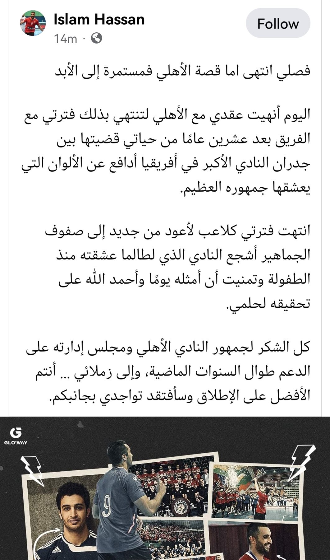 وكتب إسلام حسن لاعب يد الأهلي، عبر صفحته الشخصية على موقع التواصل الاجتماعي فيسبوك: فصلي انتهى، أما قصة الأهلي فمستمرة إلى الأبد، اليوم أنهيت عقدي مع الأهلي، لتنتهي بذلك فترتي مع جدران النادي الأكبر في إفريقيا أدافع عن الألوان التي يعشقها جمهوره العظيم.
