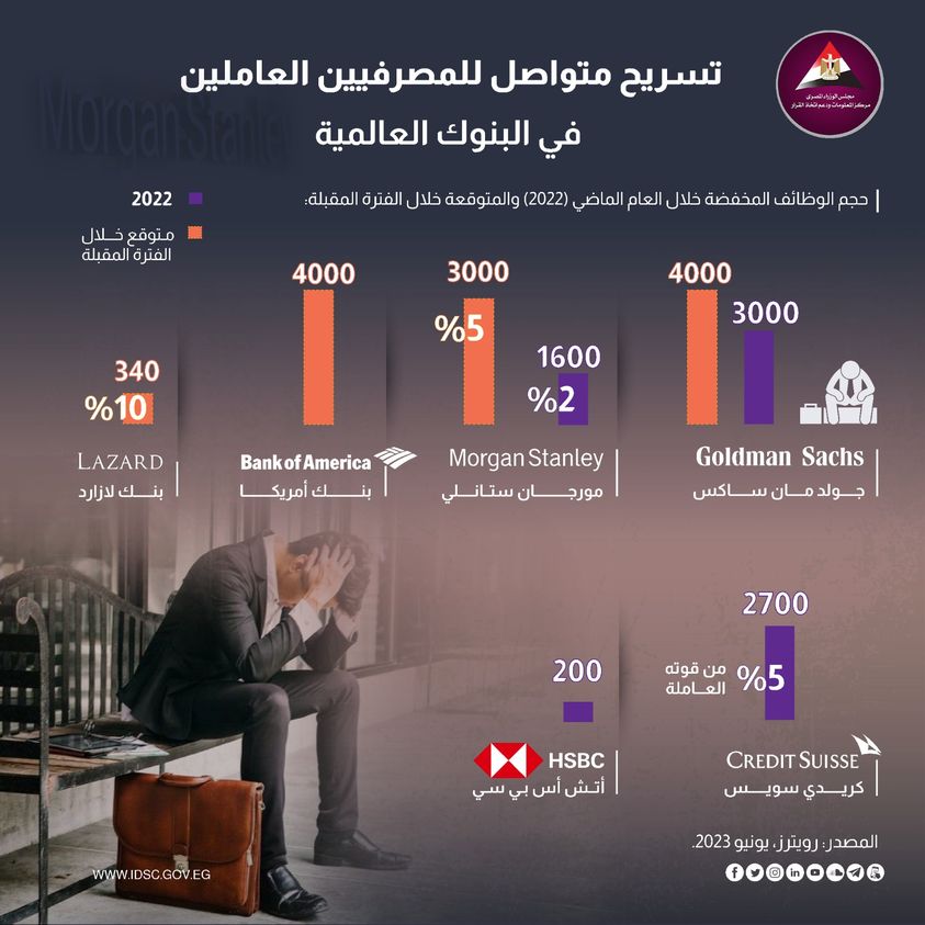 سلط مركز المعلومات ودعم اتخاذ القرار التابع لـ مجلس الوزراء الضوء على تسريح البنوك العالمية المتواصل للمصرفيين العاملين، حيث أوضح أنه مؤخرًا اتجهت البنوك العالمية نحو خفض العمالة نتيجة الأزمات المصرفية العالمية.
