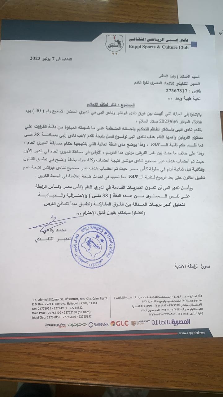 وقال إنبي في خطابه الذي أرسله لاتحاد الكرة: بالإشارة إلى المباراة التي أقيمت بين فريق نادي فيوتشر ونادي إنبي في الدوري الممتاز الأسبوع الثلاثين يوم الثلاثاء الموافق 2023/6/6 بـ ستاد السلام، يتقدم النادي بالشكر لطاقم التحكيم ولجانه المنظمة على ما شهدته المباراة من دقة القرارات على مستوى الفريقين وأهمها إلغاء هدف للفريق البترولي، لوقوع تسلل نتيجة تقدم لاعب نادي إنبي بمسافة 38 ملي كما أفاد حكم تقنية الـ VAR.