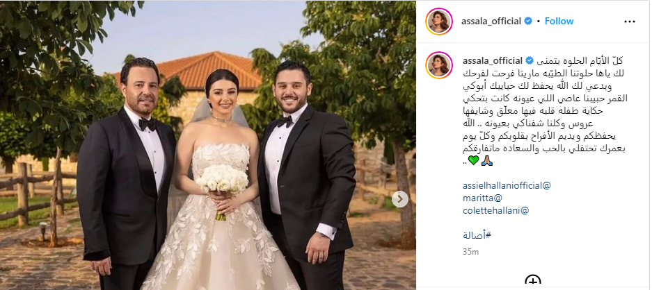 وتابعت أصالة: فرحت لفرحك وبدعي لك الله يحفظ لك حبايبك أبوكي القمر حبيبنا عاصي، اللي عيونه كانت بتحكي حكاية طفله قلبه فيها معلّق، وشايفها عروس وكلنا شفناكي بعيونه، الله يحفظكم ويديم الأفراح بقلوبكم وكلّ يوم بعمرك تحتفلي بالحب والسعادة ما تفارقكم.