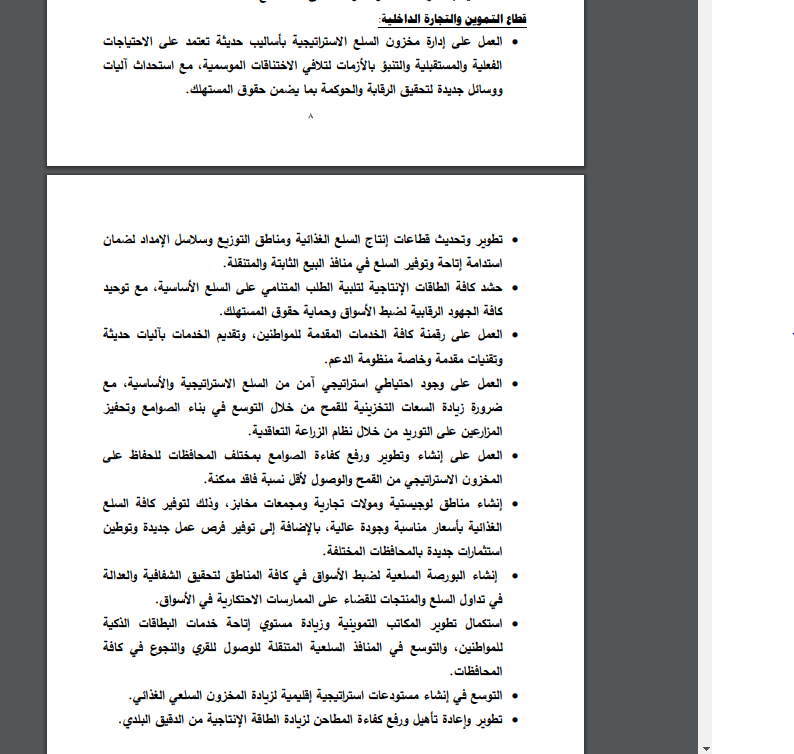 وفيما يتعلق بمستهدفات مشروع خطة التنمية الاقتصادية والاجتماعية للعام المالي 2023/ 2024، وفقًا للتقرير العام للجنة الخطة والموازنة، الخاص بقطاع التموين والتجارة الداخلية، فهو العمل على إدارة مخزون السلع الاستراتيجية بأساليب حديثة تعتمد على الاحتياجات الفعلية والمستقبلية والتنبؤ بالأزمات لتلافي الاختناقات الموسمية، مع استحداث آليات ووسائل جديدة لتحقيق الرقابة والحوكمة بما يضمن حقوق المستهلك.