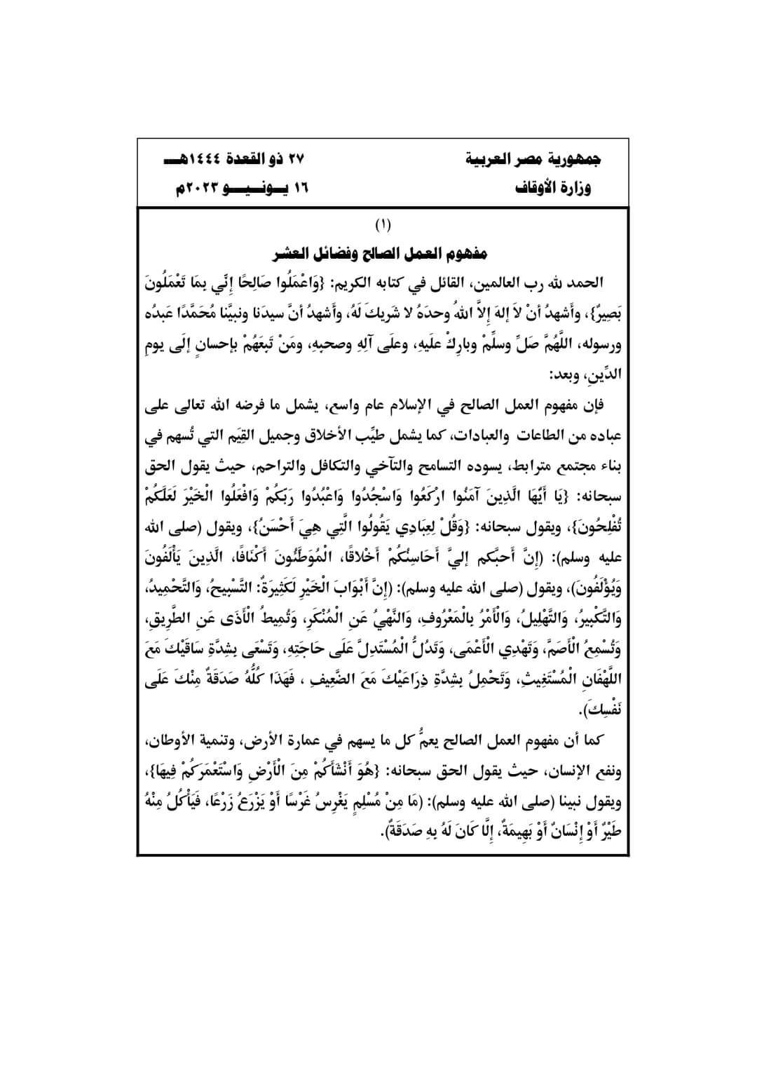 نشر الدكتور محمد مختار جمعة، وزير الأوقاف عبر صفحته الرسمية بموقع التواصل الاجتماعي فيسبوك، خطبة الجمعة المقبلة تحت عنوان: مفهوم العمل الصالح وفضائل العشر.