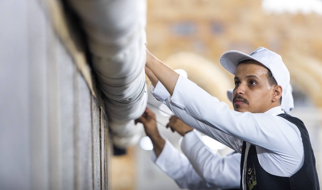 وأضاف: باشر فريق من المختصين والفنيين بالمجمع هذا الإجراء الذي يأتي الإجراءات الاحترازية المتبعة للحفاظ على نظافة وسلامة الكسوة ومنع العبث بها، إذ يشهد المطاف أعدادًا كبيرة من الحجاج تحرص على لمس ثوب الكعبة، والتعلق بأطرافه، ما يجعل الثوب عرضه لبعض الضرر وبين أن ما يُقدم عليه بعض الحجاج من قطع بعض أجزاء من ثوب الكعبة، أو التبرك بالكسوة يستند على اعتقادات خاطئة ولأجل ذلك تُرفع الكسوة إلى مسافة ثلاثة أمتار، وتحاط بقطع من القماش الأبيض بمحيط 47 مترًا، لافتا إلى أنه سيعاد الوضع إلى طبيعته بعد انتهاء الموسم.