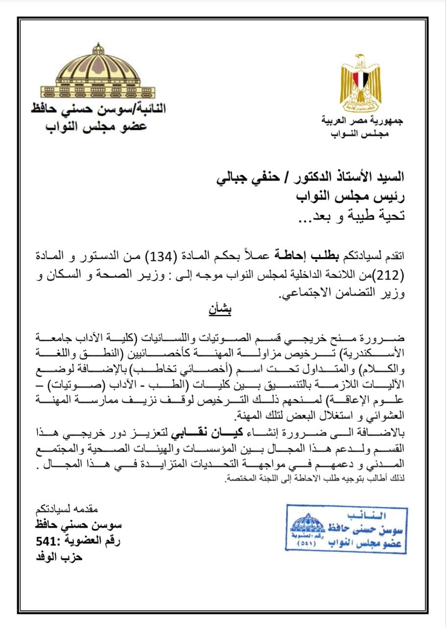 تقدمت النائبة سوسن حسني حافظ؛ عضو مجلس النواب، بطلب إحاطة موجه إلى وزير الصحة والسكان ووزير التضامن الاجتماعي، بشأن ضرورة منح خريجي قسم الصوتيات واللسانيات بكلية الآداب جامعة الإسكندرية، ترخيص مزاولة المهنة كأخصائيين (النطق واللغة والكلام) والمتداول تحت اسم (أخصائي تخاطب).