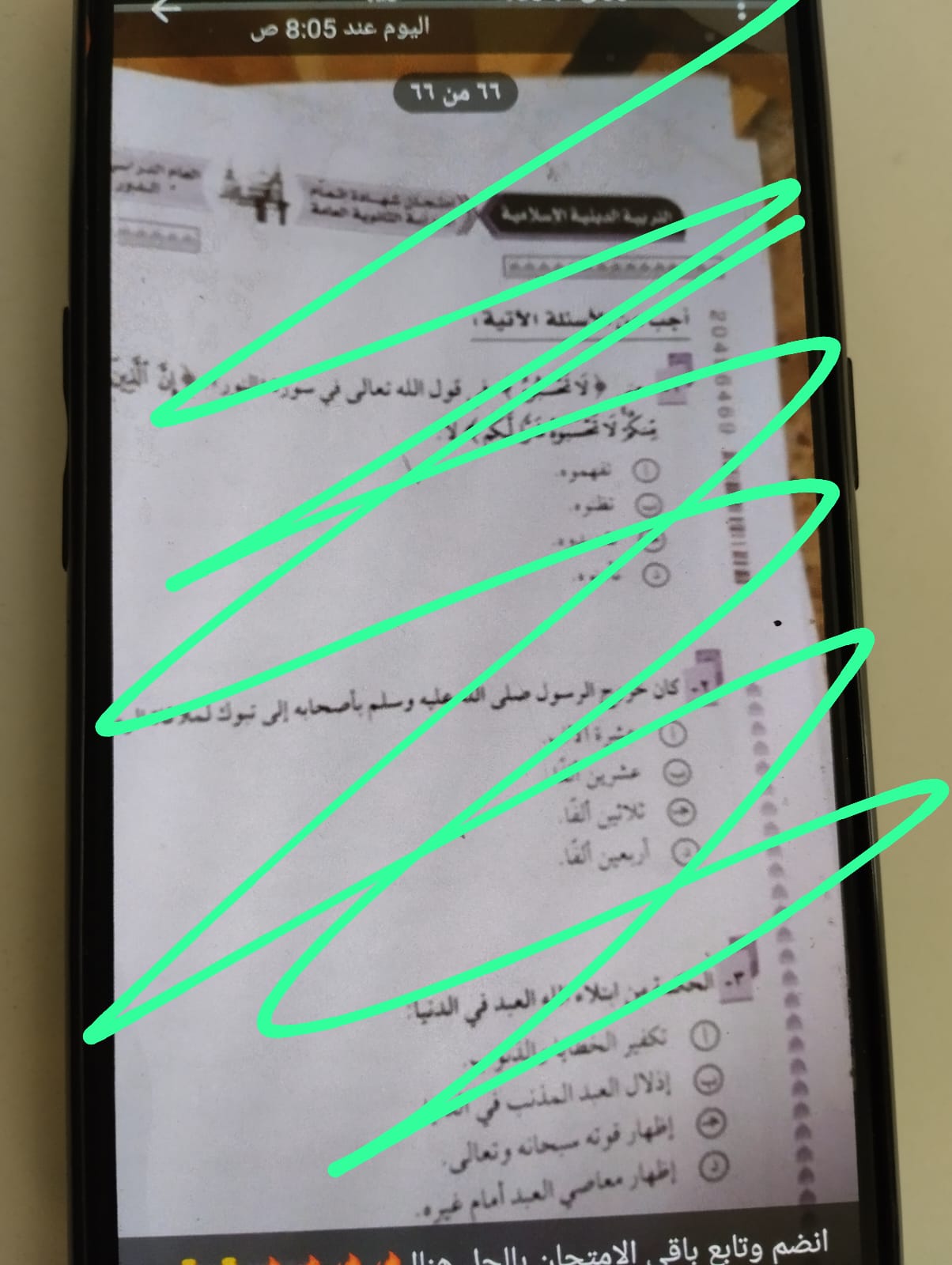 ومن جانبه، نشر أدمن شاومينج للغش الإلكتروني عددًا من الصور، زعم أنها خاصة بامتحان التربية الدينة “الدين”، الخاص بطلاب الثانوية العامة 2023، والتي يعقد الآن داخل اللجان.