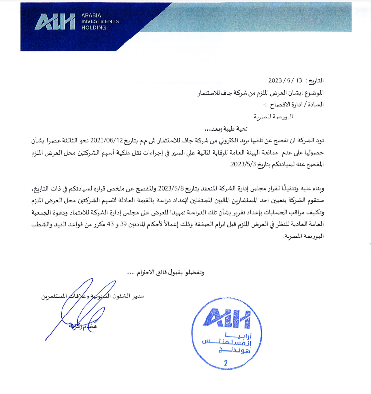 أعلنت شركة آرابيا انفستمنتس هولدنج، في بيان لـ البورصة المصرية اليوم الثلاثاء، عن حصول شركة جاف للاستثمار على موافقة الهيئة العامة للرقابة المالية للسير في إجراءات نقل ملكية أسهم شركتي يو إي فاينانس ورواج للتمويل الاستهلاكي التابعتين لها.