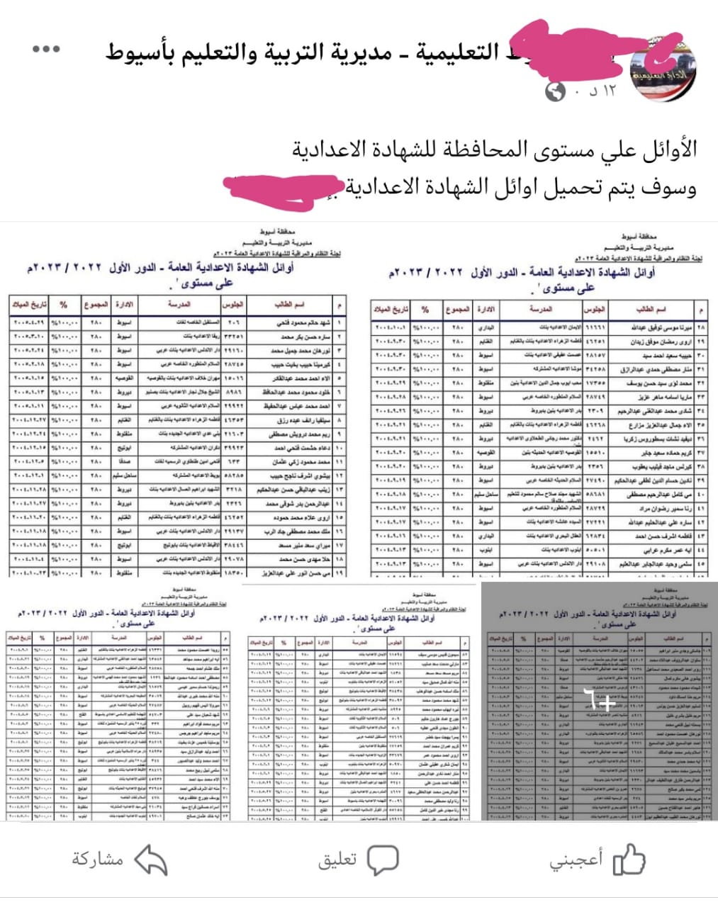 نشرت صفحة تابعة لإحدى الإدارات التعليمية التابعة لمديرية التربية والتعليم بمحافظة أسيوط، كشوف أوائل الشهادة الإعدادية العامة أسيوط، قبل اعتماد النتيجة رسميا من اللواء عصام سعد محافظ أسيوط.