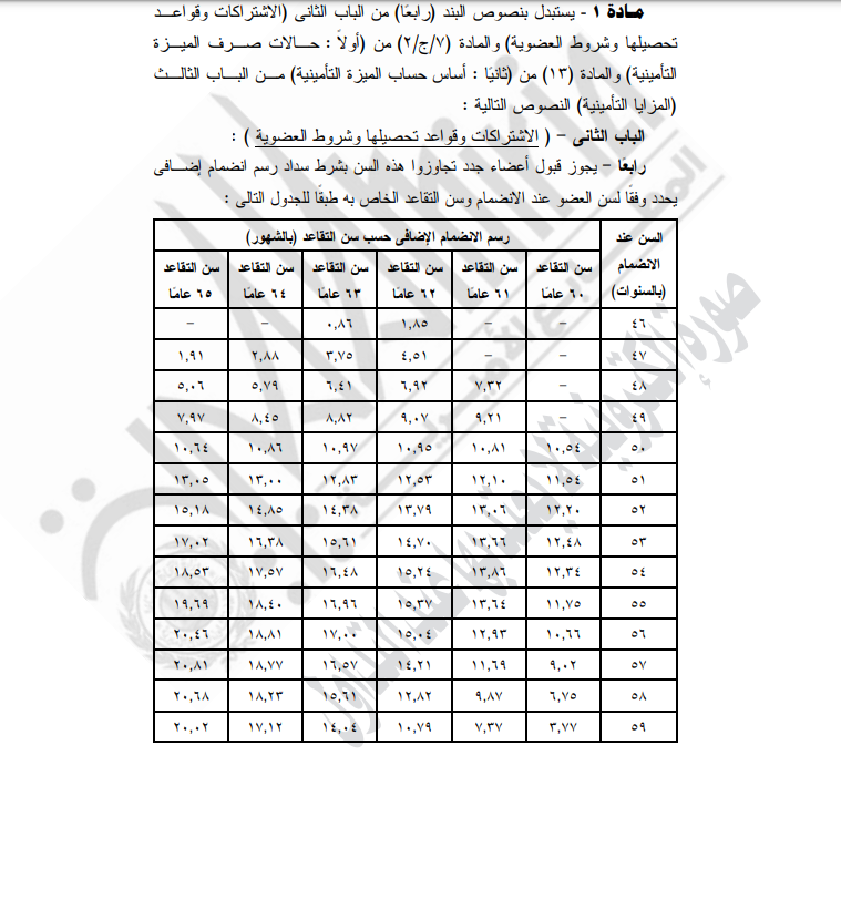 وجاء في نص المادة الأولى، من باب الاشتراكات وقواعد تحصيلها وشروط العضوية، أن يجوز قبول أعضاء جدد تجاوزوا السن بشرط سداد رسم انضمام إضافي يحدد وفقًا لسن العضو عند الانضمام وسن التقاعد الخاص به طبقًا للجدول التالي:-