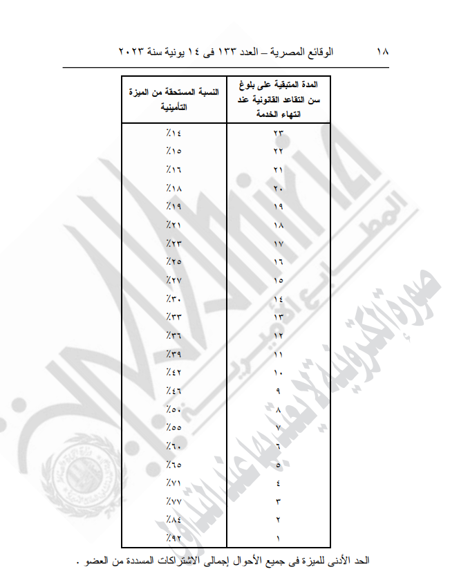 بينما نصت المادة رقم 7، أنه فى حالات انتهاء الخدمة بسبب الخروج للمعاش المبكر، وفى حالة عدم قيام الشركة بسداد قيمة الخلل فـي أمـوال الـصندوق نتيجـة هذا الخروج، تحسب للعضو الميزة التأمينية المستحقة وفقًا للبند أ بذات المادة حتـى تـاريخ انتهاء الخدمة بالشركة بحد أقصى مائة وعشرون شهرا ثم تصرف هذه الميـزة طبقًا للجدول التالي:-