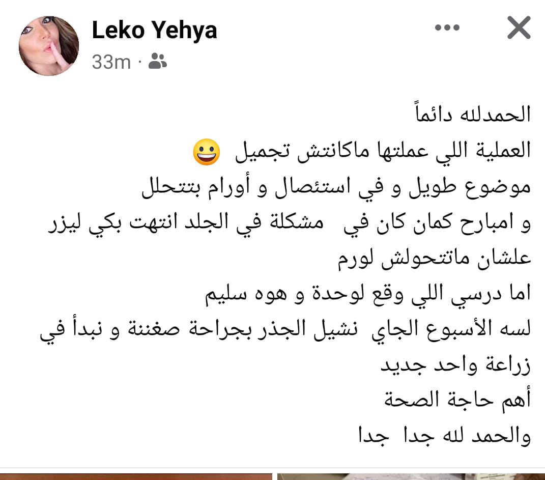 وكتب لقاء سويدان عبر حسابها على فيس بوك: الحمد لله دائمًا.. العملية اللي عملتها مكانتش تجميل.. موضوع طويل وفيه استئصال وأورام بتتحلل.. وإمبارح كمان كان فيه مشكلة في الجلد انتهت بكي ليزر علشان ماتتحولش لورم.