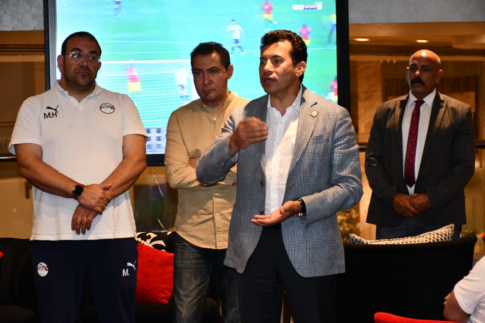 وشارك وزير الرياضة اللاعبين في مشاهدة الشوط الأول من مباراة المنتخب الأول لكرة القدم بمباراته بالجولة الخامسة بتصفيات الأمم الإفريقية، والمقامة بالمغرب بين منتخبنا القومي الأول أمام نظيره الغيني.