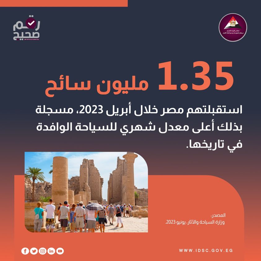 كشف مركز المعلومات ودعم اتخاذ القرار التابع لـ مجلس الوزراء عن استقبال مصر 1.35 مليون سائح خلال أبريل 2023، وتوقعات بوصول الرقم إلى 15 مليون سائح بنهاية العام.