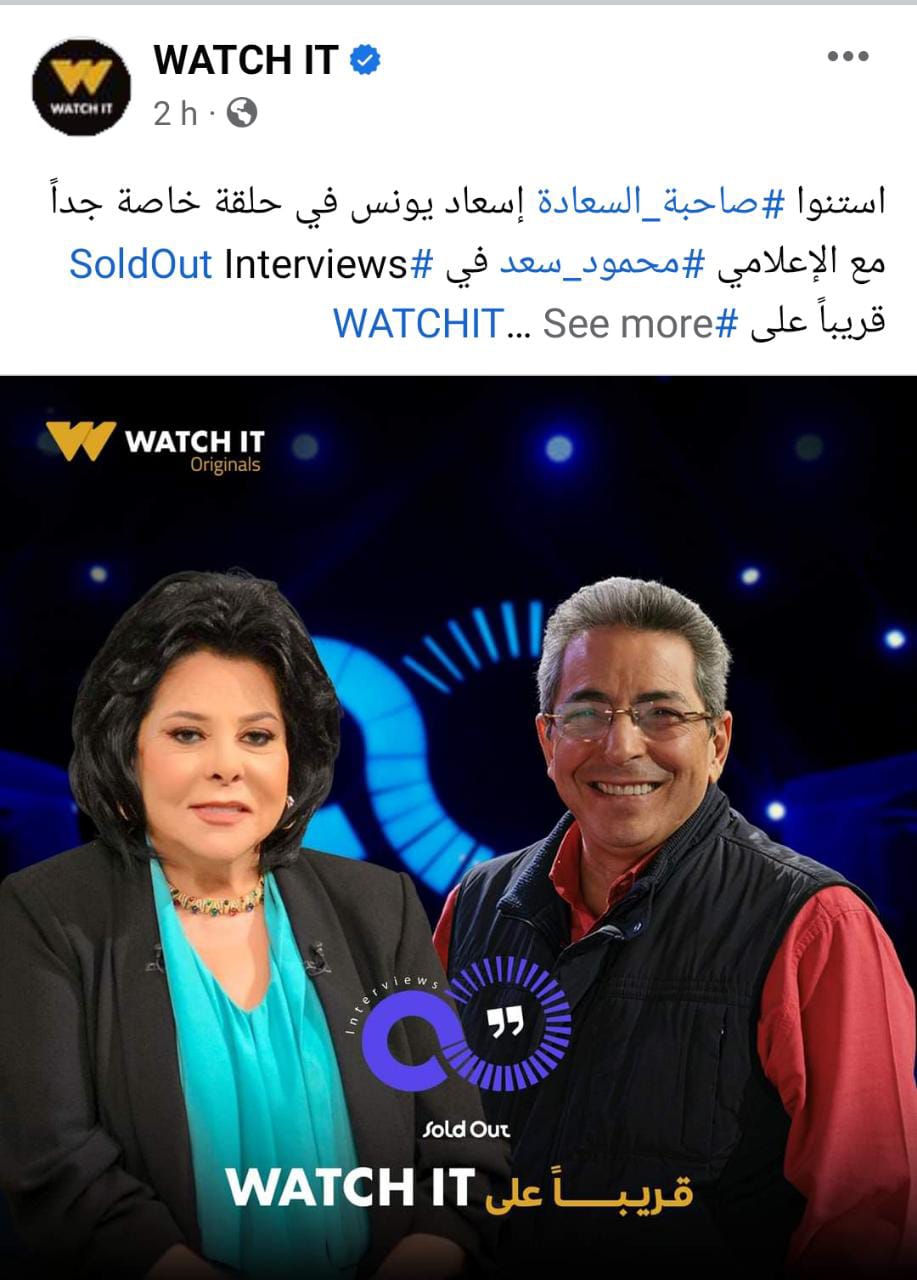 وروجت منصة watch it، للقاء الإعلامي محمود سعد مع الفنانة إسعاد يونس في برنامج Sold Out، حيث نشرت عبر صفحتها الرسمية بموقع التواصل الاجتماعي فيس بوك: استنوا صاحبة السعادة إسعاد يونس في حلقة خاصة جدًا مع الإعلامي محمود سعد في Sold Out، قريبًا على watch it.