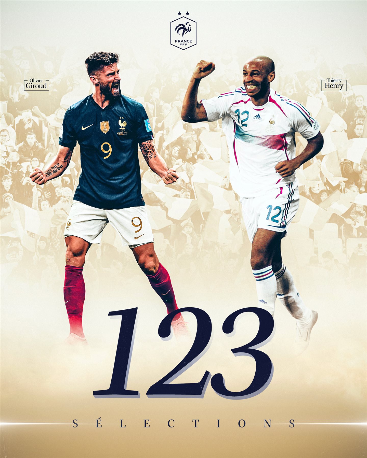 عادل المهاجم الفرنسي جيرو رقم الأسطورة الفرنسية تييري هنري، كثالث أكثر لاعب مشاركة بقميص الديوك، بواقع 123 مباراة.