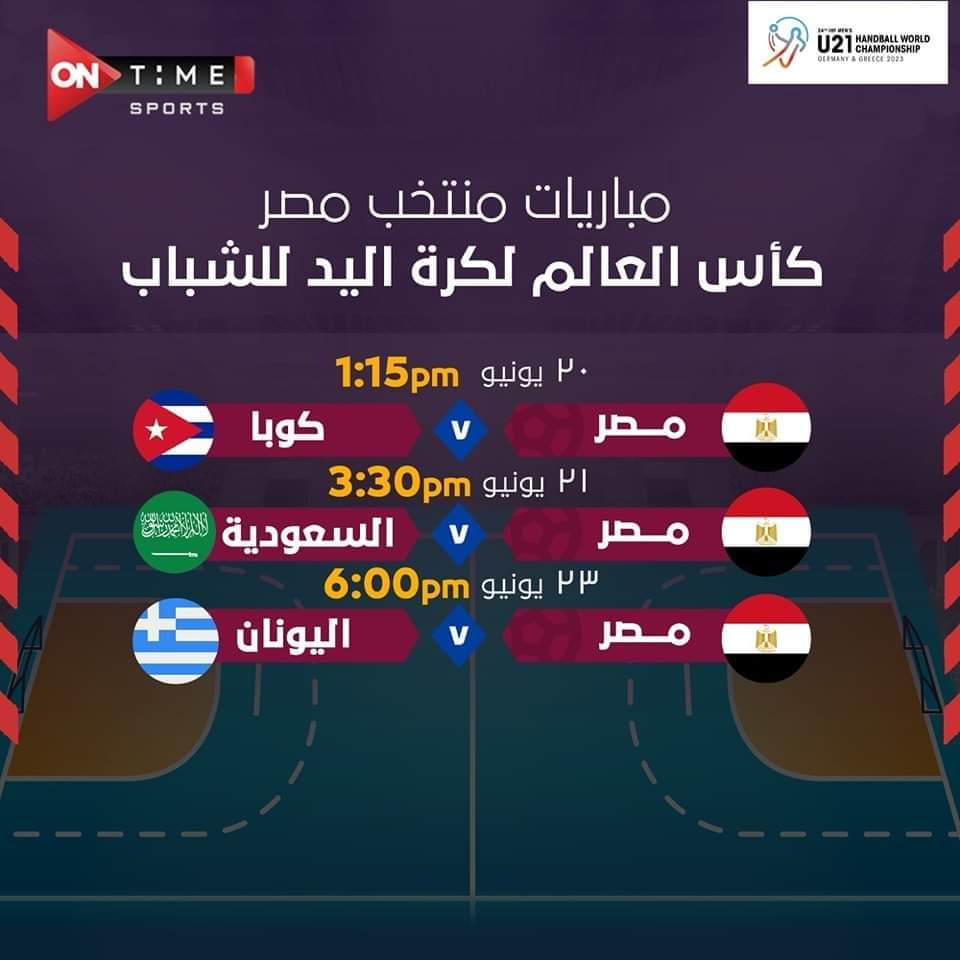 حصلت قنوات أون تايم سبورت على حقوق بث مباريات منتخب مصر في بطولة العالم لكرة اليد الشباب مواليد 2002، في نسختها الـ24، والتي ستقام بتنظيم مشترك بين اليونان وألمانيا خلال الفترة من 19 يونيو الجاري وحتى 3 يوليو الشهر المقبل.
