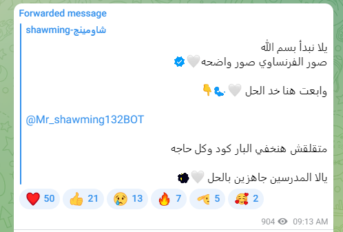 وقال أدمن جروب شاومينج السري لنشر الامتحانات، للطلاب: يلا نبدأ بسم الله، صور الفرنساوي صور واضحة وابعت هنا خد الحل، متقلقش هنخفي البار كود وكل حاجة، متابعا: يالا المدرسين جاهزين بالحل.